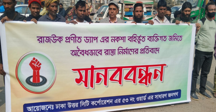 নকশার বহির্ভূত ব্যক্তিগত জমিতে অবৈধ সড়ক নির্মাণের অভিযোগে তুরাগে মানববন্ধন, আদালতে মামলা