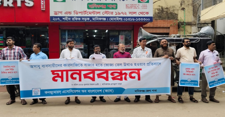 মানিকগঞ্জে ভোজ্য তেলের কৃত্রিম সংকটের প্রতিবাদে ক্যাবের মানববন্ধন