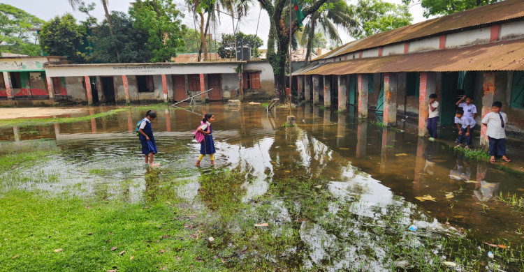 শেরপুরের ঝিনাইগাতী মডেল সরকারি প্রাথমিক বিদ্যালয়: সামান্য বৃষ্টিতেই বিদ্যালয় মাঠে পানি