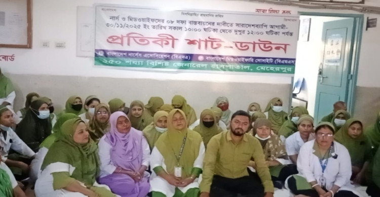মেহেরপুরে নার্সদের ৮ দফা দাবি আদায়ে প্রতীকী ২ ঘণ্টার শাটডাউন কর্মসূচি পালন