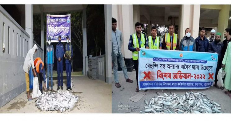 কুয়াকাটায় নৌ পুলিশ ও কোস্টগার্ডের অভিযানে জাটকাসহ বিপুল পরিমাণ নিষিদ্ধ জাল জব্দ