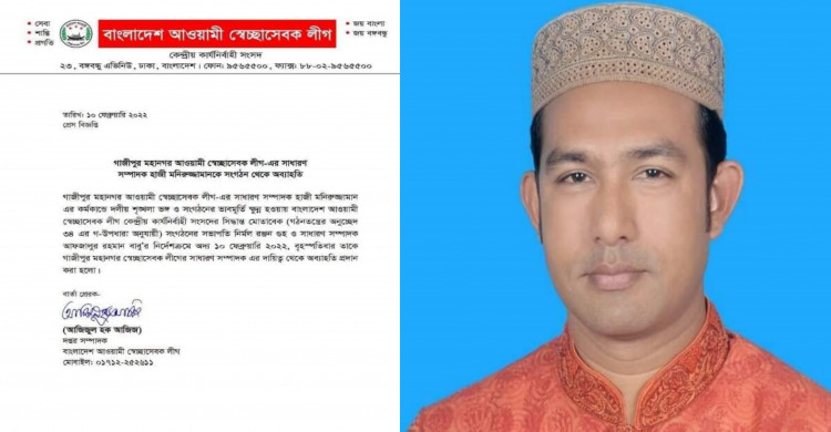 বাংলাদেশ আওয়ামী স্বেচ্ছাসেবক লীগ কেন্দ্রীয় কার্যনির্বাহী সংসদের সিদ্ধান্ত মোতাবেক সংগঠনের সভাপতি নির্মল রঞ্জন গুহ ও সাধারণ সম্পাদক আফজালুর রহমান বাবুর নির্দেশক্রমে এ অব্যাহতির ঘোষণা দেয়া হয় বলে জানান স্থানীয় নেতাকর্মীরা।