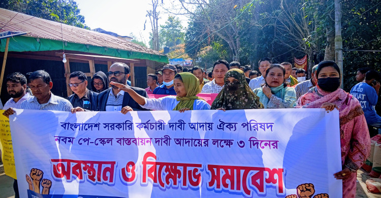 বিলাইছড়িতে নবম পে-স্কেল বাস্তবায়নের দাবিতে সরকারি কর্মচারীদের বিক্ষোভ ও অবস্থান কর্মসূচি