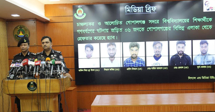 গোপালগঞ্জ সদরে বিশ্ববিদ্যালয়ের শিক্ষার্থীকে গণধর্ষণের ঘটনায় জড়িত ৬ জনকে বিভিন্ন এলাকা থেকে গ্রেপ্তার করেছে পুলিশের এলিট ফোর্স র্যাব। র্যাব বলছে, প্রথমে ওই শিক্ষার্থীকে ইভটিজিং করা হয়। প্রতিবাদ করায় জোর করে তুলে নিয়ে দলবদ্ধ ধর্ষণ করে। জড়িতরা পেশাদার অপরাধী। প্রত্যেকের বিরুদ্ধে একাধিক মামলা রয়েছে। তবে তাদের রাজনৈতিক সংশ্লিষ্টতা পাওয়া যায়নি।