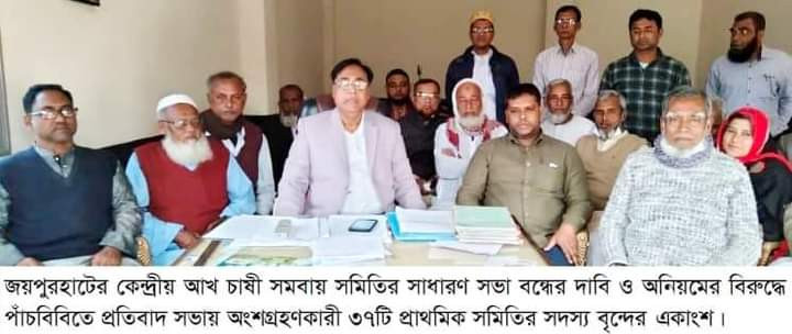 এত কিছুর পরেও ভূঁয়া প্রতিনিধিদের নিয়ে সাধারণ সভা করার চেষ্টা করলে জয়পুরহাট কেন্দ্রীয় আখ চাষী সমবায় সমিতির ৪১টি প্রাথমিক সমিতির মধ্যে ৩৭টি প্রাথমিক সমিতির প্রতিনিধিবৃন্দ জমায়েত হয়ে এই প্রতিবাদ সভা করেন এবং প্রহশনের সাধারণ সভা বন্ধসহ অত্র সমিতিতে ঘটে যাওয়া বিগত দিনের অনিয়ম এবং দুর্নীতির বিরুদ্ধে ৪৯ ধারায় সুষ্ঠু তদন্ত পূর্বক বিচারের দাবি করেন এবং অর্ন্তবতী কালীন কমিটি করে নির্বাচনের মাধ্যমে একটি কমিটি গঠনের দাবি জানান।