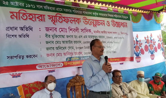 শনিবার বিকেলে স্বাধীনতা ও জাতীয় দিবসে নবাবগঞ্জ উপজেলার পুটিমারা ইউপি’র মতিহারা গ্রামের বিশিষ্ট্য শিক্ষানুরাগী ব্যক্তিত্ব আইয়ুব আলী সরদার ও তার দুই পুত্র আবুল কাশেম সরদার ও মতিয়ার রহমান সরদার অপর জন ভাতিজা আলতাফ সরদার ১৯৭১ সালের ২৫ অক্টোবর মতিহারা গ্রামের সরদার পাড়া থেকে পাকসেনারা তাদেরকে গুম করে পাশ্ববর্তী ঘোড়াঘাট উপজেলার বলাহার পাকক্যাম্পে নিয়ে গিয়ে গণহত্যা করে। তাদের স্মরণে প্রধান অতিথি হিসেবে মতিহারা স্মৃতিফলক ১৯৭১ শুভ উদ্বোধন করেন জনতা ব্যাংক লিঃ এর পরিচালনা পর্ষদের চেয়ারম্যান বীর মুক্তিযোদ্ধা ড. এস এম মাহফুজুর রহমান।