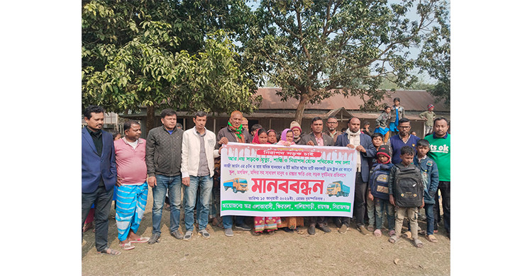 রায়গঞ্জে কাজী ফার্মের ভারী যানবাহন ও অবৈধ মাটি বহনের প্রতিবাদে মানববন্ধন