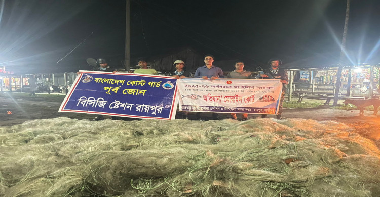 রায়পুর মেঘনা নদীতে মৎস্য কর্মকর্তার অভিযান কারেন্ট জাল, ইলিশ জব্দ