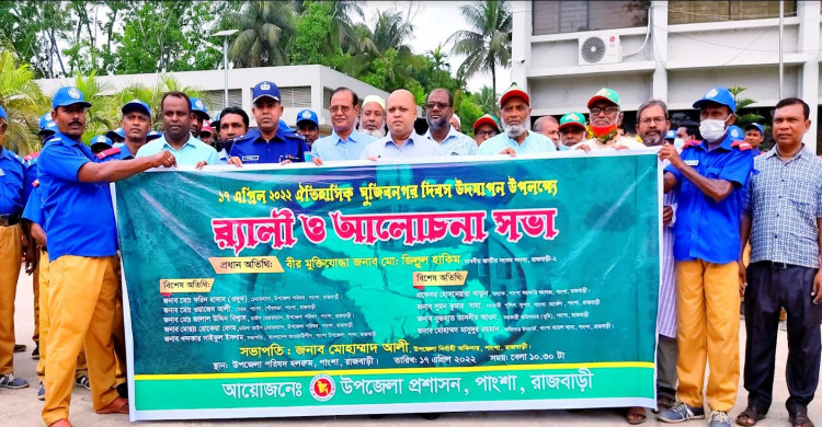 রাজবাড়ীর পাংশা উপজেলা প্রশাসনের আয়োজনে ঐতিহাসিক মুজিবনগর দিবস উপলক্ষে বঙ্গবন্ধুর প্রতিকৃতিতে পুষ্পস্তবক অর্পণ, শোভাযাত্রা ও আলোচনা সভা অনুষ্ঠিত হয়েছে। রোববার (১৭ এপ্রিল) সকাল ১০টায় উপজেলা পরিষদ চত্বরে জাতির জনক বঙ্গবন্ধু শেখ মুজিবুর রহমানের প্রতিকৃতিতে পুষ্পস্তবক অর্পণ করা হয়। পরে উপজেলা পরিষদ চত্বর থেকে একটি শোভাযাত্রা বের হয়। শোভাযাত্রা শেষে উপজেলা নির্বাহী কর্মকর্তা (ইউএনও) মোহাম্মাদ আলীর সভাপতিত্বে উপজেলা পরিষদের হলরুমে আলোচনা সভা অনুষ্ঠিত হয়।