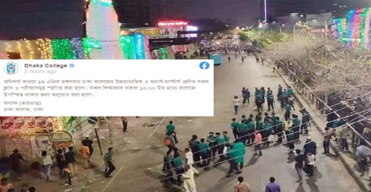 ঢাকা কলেজের ভারপ্রাপ্ত অধ্যক্ষের নির্দেশনায় দেয়া ওই ঘোষণায় উল্লেখ করা হয়, ‘অনিবার্য কারণে ১৯ এপ্রিল, মঙ্গলবার ঢাকা কলেজের উচ্চ মাধ্যমিক ও অনার্স-মাস্টার্স শ্রেণির ক্লাস ও পরীক্ষা সমূহ স্থগিত করা হলো। সকল শিক্ষককে সকাল ১০টার মধ্যে কলেজে উপস্থিত থাকার জন্য অনুরোধ করা হলো।’