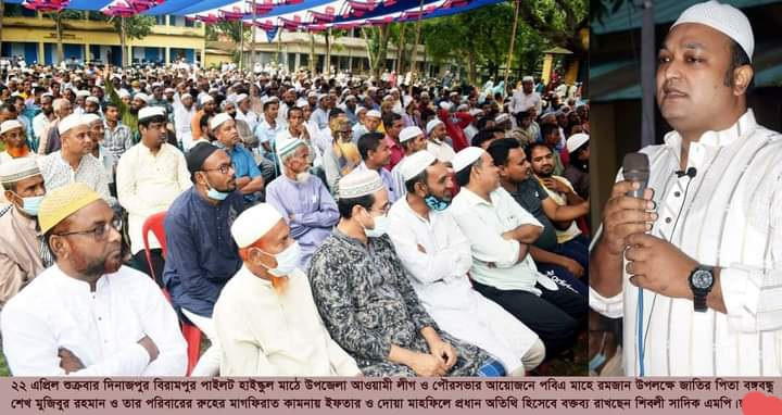 জাতির পিতা বঙ্গবন্ধু শেখ মুজিবুর রহমান ও তার পরিবারের শহীদদের রুহের মাগফিরাত কামনায় দিনাজপুরের বিরামপুর উপজেলা আওয়ামী লীগ ও পৌরসভার আয়োজনে ইফতার ও দোয়া মাহফিল অনুষ্ঠিত হয়েছে। শুক্রবার (২২ এপ্রিল) বিকেল ৫টায় পৌর শহরের পাইলট উচ্চ বিদ্যালয় চত্বরে ইফতার ও দোয়া মাহফিলে প্রধান অতিথির বক্তব্য রাখেন দিনাজপুর-৬ আসনের সংসদ সদস্য ও সমাজকল্যাণ মন্ত্রণালয় সম্পর্কিত স্থায়ী কমিটির অন্যতম সদস্য মো. শিবলী সাদিক।