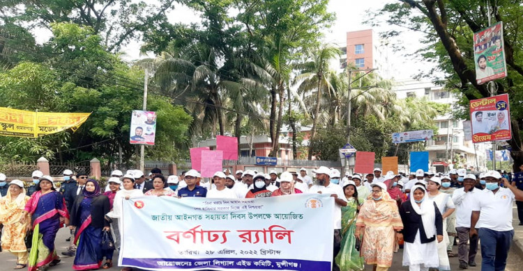 ‘বিনা খরচে নিন আইনি সহায়তা, শেখ হাসিনার সরকার দিচ্ছে এই নিশ্চয়তা’ প্রতিপাদ্যে মুন্সীগঞ্জ জেলা সদরে জাতীয় আইনগত সহায়তা দিবস উদযাপন উদযাপন করা হয়েছে। দিবসটি উদযাপন উপলক্ষে বৃহস্পতিবার (২৮ এপ্রিল) জেলা লিগ্যাল এইড কমিটির আয়োজনে ও ব্যানারে বর্ণাঢ্য শোভাযাত্রা বের করা হয়। শোভাযাত্রাটি জেলা জজকোর্ট প্রাঙ্গণ থেকে পতাকা একাত্তর হয়ে পুনরায় জজকোর্ট প্রাঙ্গণে গিয়ে শেষ হয়।