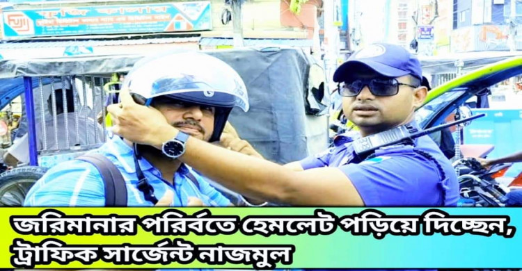 সরজমিন দেখা যায়, ড্রাইভিং লাইসেন্স ও হেলমেটবিহীন চালকের বিরুদ্ধে আইনি ব্যবস্থা নেয়া হচ্ছে। কিন্তু ব্যবস্থা নেয়ার চিত্রটা একটু ভিন্ন। হেলমেটবিহীন চালকের জরিমানার বদলে তাদের হেলমেট কিনে পরিয়ে দিচ্ছেন কর্মরত এই পুলিশ সার্জেন্ট।
