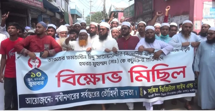 ভারতের ক্ষমতাসীন দলের দুই নেতা বিশ্বমহানবী হযরত মোহাম্মদ (সা.) কে নিয়ে আপত্তির মন্তব্যের প্রতিবাদে ব্রাহ্মণবাড়িয়ার নবীনগরে বিক্ষোভ মিছিল করেছে হাজারো তৌহিদী জনতা।