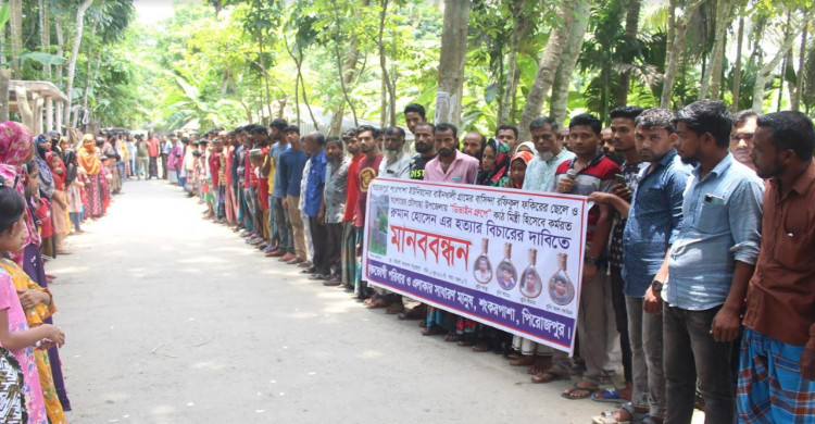 পিরোজপুরে রুমান হোসেনকে হত্যার বিচারের দাবি নিয়ে রাস্তায় মানববন্ধন করেছেন নিহতের বাবা-মা, পরিবারের সদস্য এবং এলাকাবাসী। শুক্রবার (১০ জুন) দুপুর ১২টায় সদর উপজেলার শংকরপাশা ইউনিয়নের বাইনখালী গ্রামে এ মানববন্ধন অনুষ্ঠিত হয়।