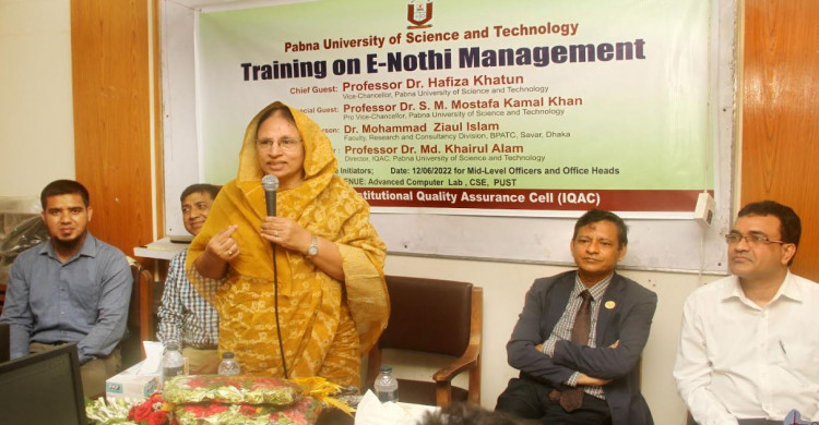 পাবনা বিজ্ঞান প্রযুক্তি বিশ্ববিদ্যালয়ে শনিবার (১১ জুন) ই-নথি ব্যবস্থাপনা বিষয়ে কর্মকর্তাদের দুই দিনব্যাপী এক কর্মশালা শুরু হয়েছে। সকাল ৯ টায় ই-নথি কর্মশালাটি উদ্বোধন করেন উপাচার্য অধ্যাপক ড. হাফিজা খাতুন। উদ্বোধনী অনুষ্ঠানে প্রধান অতিথি হিসেবে বিশ্ববিদ্যালয়ের উপাচার্য অধ্যাপক ড. হাফিজা খাতুন, বিশেষ অতিথি ছিলেন উপ উপাচার্য অধ্যাপক ড. এস এম মোস্তফা কামাল খান উপস্থিত ছিলেন। প্রশিক্ষণে ৩০ জন কর্মকর্তা অংশগ্রহণ করেন।