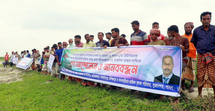 মানববন্ধনে ভুক্তভুগী কৃষকরা অভিযোগ করে বলেন, সুজানগর উপজেলার ভায়না, লক্ষ্মীপুর, চলদা, চরতারাপুর, চরমানিকদীর, চরবিশ্বনাথপুরে একটি প্রভাবশালী মহল ইজারা নিয়ে পদ্মা নদীর বিভিন্ন জায়গা থেকে অপরিকল্পিতভাবে ড্রেজার দিয়ে বালু কেটে নেয়ার ফলে শত শত বিঘা আবাদি জমি ঝুঁকির মুখে পড়েছে। দুই ফসলি জমিতে পাট, ধান, বাদাম, তিল, ভুট্টা, পেঁয়াজ, রসুন, ছোলাসহ বিভিন্ন ফসল আবাদ হয়। সাধারণ কৃষকরা জীবিকা নির্বাহ করে এসব চরের জমি দিয়ে।