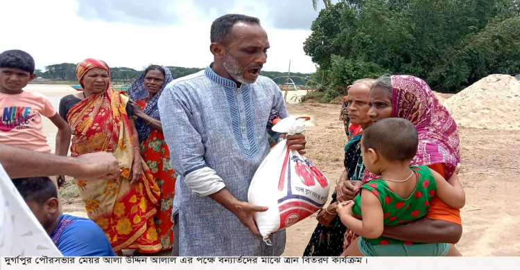 দুর্গাপুরে বন্যাদুর্গতদের মাঝে পৌর মেয়র আলালের চাল বিতরণ
