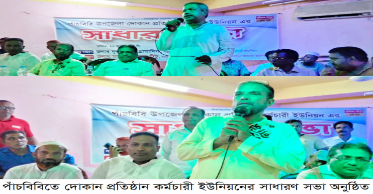 জয়পুরহাটের পাঁচবিবি উপজেলার দোকান প্রতিষ্ঠান কর্মচারী ইউনিয়নের সাধারণ সভা অনুষ্ঠিত হয়েছে। শনিবার (২৫ জুন) সকাল ১০টায় পৌর কমিউনিটি সেন্টারে দোকান প্রতিষ্ঠান কর্মচারী ইউনিয়নের সাধারণ সভায় অত্র ইউনিয়নের সভাপতি নূর আলম প্রামাণিকের সভাপতিত্বে ও সম্পাদক মাহাবুব আলম টিটুর সার্বিক ব্যবস্থাপনায় প্রধান অতিথির বক্তব্য রাখেন বাংলাদেশ সংযুক্ত শ্রমিক ফেডারেশনের সম্পাদক ও জয়পুরহাট জেলা মোটর শ্রমিক ইউনিয়নের সভাপতি জাহাঙ্গীর আলম চৌধুরী।