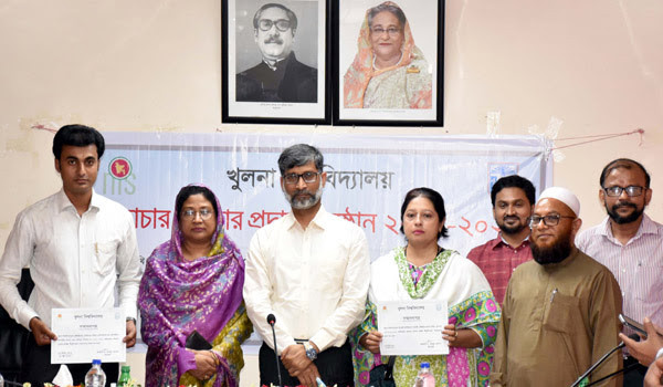 খুলনা বিশ্ববিদ্যালয়ের শহীদ তাজউদ্দীন আহমদ ভবনের সম্মেলন কক্ষে আজ মঙ্গলবার (২৮ জুন) বেলা ১১টায় একজন করে কর্মকর্তা ও কর্মচারীকে প্রথমবারের মতো শুদ্ধাচার পুরস্কার প্রদান করা হয়। খুলনা বিশ্ববিদ্যালয়ের উপাচার্য প্রফেসর ড. মাহমুদ হোসেন প্রধান অতিথি হিসেবে এ পুরস্কার প্রদান করেন। পুরস্কারস্বরূপ তাদের একটি ক্রেস্ট, সনদপত্র ও মূল বেতনের সমপরিমাণ অর্থ প্রদান করা হয়।