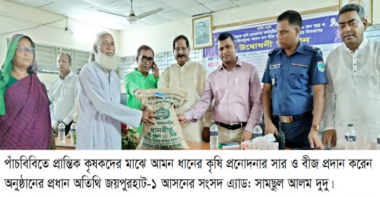 জয়পুরহাটের পাঁচবিবিতে উপজেলা প্রশাসন ও কৃষি সম্প্রসারণ অধিদপ্তর, পাঁচবিবি, জয়পুরহাটের বাস্তবায়নে আজ মঙ্গলবার বেলা ১১টায় উপজেলা পরিষদ মিলনায়তনে ২০২১-২০২২ অর্থ বছরের আমন ধানের কৃষি প্রনোদনা কর্মসূচীর আলোচনা সভায় সভাপতিত্ব করেন উপজেলা নির্বাহী কর্মকর্তা মোঃ বরমান হোসেন। প্রধান অতিথি ছিলেন জয়পুরহাট-১ আসনের সংসদ এ্যাড: সামছুল আলম দুদু। বক্তব্য রাখেন উপজেলা চেয়ারম্যান মনিরুল শহীদ মুন্না, ভাইস চেয়ারম্যানদ্বয় সোহরাব হোসেন ও রাজিনারা টুনি, থানার অফিসার ইনচার্জ পলাশ চন্দ্র দেব, উপজেলা আ.লীগের সভাপতি আবু বকর সিদ্দিক মন্ডল প্রমুখ। স্বাগত বক্তব্য রাখেন উপজেলা কৃষি কর্মকর্তা লুৎফর রহমান। উপজেলার ৮টি ইউনিয়ন ও পৌরসভার ১১০০ জন ক্ষুদ্র ও প্রান্তিক কৃষকদের মাঝে বিনামূল্যে আমন ধানের বীজ ৫ কেজি, ১০ কেজি ডিএপি, ১০ কেজি এমওপি সার কৃষকদের মধ্যে প্রদান করেন অনুষ্ঠানের প্রধান অতিথি।