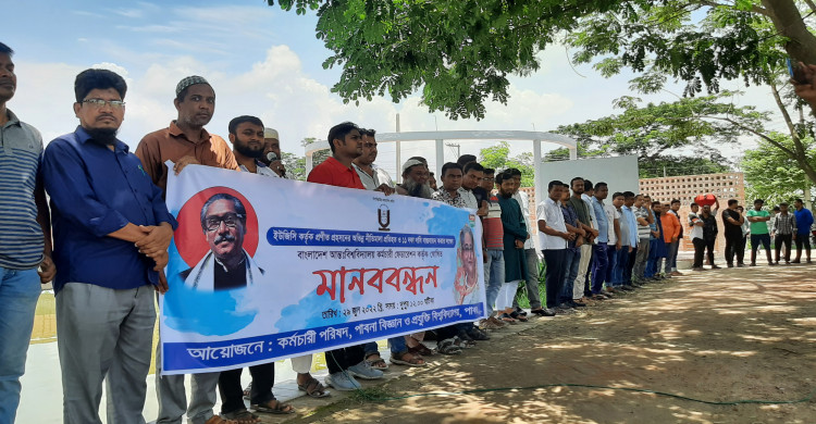 ১১ দফা দাবিতে পাবনা বিজ্ঞান ও প্রযুক্তি বিশ্ববিদ্যালয়ের (পাবিপ্রবি) কর্মচারী পরিষদ মানববন্ধন ও স্মারকলিপি পেশ করেছে। বুধবার (২৯ জুন) দুপুরে ক্যাম্পাস চত্বরে বিশ্ববিদ্যালয়ের কর্মচারী পরিষদ ইউজিসি কর্তৃক অভিন্ন নীতিমালার প্রতিবাদসহ ১১ দফা দাবিতে এ মানববন্ধন করে।