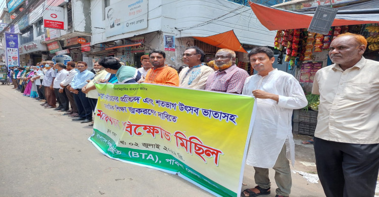 ঢাকার আশুলিয়ায় শিক্ষক উৎপল কুমার সরকারের হত্যাকাকাণ্ড ও নড়াইলে অধ্যক্ষ স্বপন কুমার বিশ্বাসকে জনসম্মুখে গলায় জুতার মালা পরানোর ঘটনার সাথে জড়িতদের শাস্তির দাবিতে পাবনায় মানববন্ধন ও প্রতিবাদ সভা করেছেন শিক্ষকরা। শনিবার (২ জুলাই) বাংলাদেশ শিক্ষক সমিতি পাবনা জেলা শাখার আয়োজনে পাবনা প্রেসক্লাবের সামনে এ কর্মসূচি পালিত হয়।