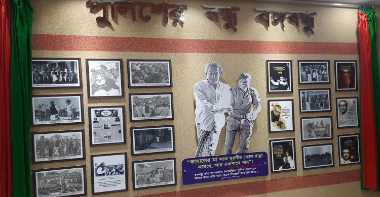 মূল ছবিতে নিজ বাসভবনের লুঙ্গি পরা বঙ্গবন্ধু আদর করে খাওয়ার জন্য ডেকে নিচ্ছেন তার নিরাপত্তার কাজে থাকা এক পুলিশ সদস্যকে। এই মহামানবের পুলিশের সঙ্গে ঐতিহাসিক নানা মুহূর্তেও বেশকিছু স্থিরচিত্র আগামী প্রজন্মের পুলিশ সদস্য ও জেলা পুলিশ সুপার কার্যালয়ে আগত সকলেই একনজরে দেখতে পাবেন।
