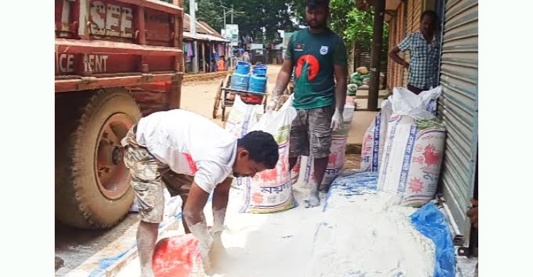 সরেজমিন দেখা যায়, মাটিতে পলিথিন বিছিয়ে অস্বাস্থ্যকর পরিবেশে খোলা মাঠে রোদে শুকানোর পর ভেজা ময়দাগুলোর বস্তা পরিবর্তন করে পা দিয়ে পাড়িয়ে অন্য বস্তায় ভরছে। কর্মচারীদের শরীরের ঘাম ঝরছে এবং ময়দার সাথে মিশছে।