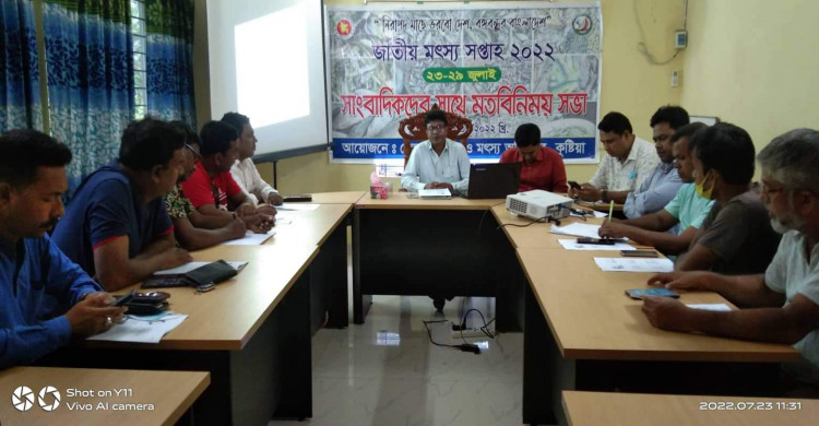 ২৩শে জুলাই"নিরাপদ মাছে ভরবো দেশ,বঙ্গবন্ধুর বাংলাদেশ" প্রতিপাদ্য এই শ্লোগানকে সামনে রেখে জাতীয় মৎস্য সপ্তাহ ২০২২ উপলক্ষে কুষ্টিয়া জেলা প্রশাসন ও মৎস্য অধিদপ্তর কুষ্টিয়ার আয়োজনে সাংবাদিকদের সাথে জেলা মৎস্য অফিসে এক মতবিনিময় সভা অনুষ্ঠিত হয়। এই মতবিনিময় সভায় বিভিন্ন মিডিয়ার সাংবাদিকদের সামনে জেলা মৎস্য অফিসার নিপেন্দ্রনাথ বিশ্বাস বলেন অন্যান্য জেলার তুলনায় আমাদের কুষ্টিয়া জেলায় মৎস্য উৎপাদন অনেকটাই কম তাই আমাদের আশেপাশে যেসব নদী-নালা-খাল-বিল এবং অপ্রয়োজনীয় পুকুর পড়ে আছে সেগুলোর সদ্য ব্যবহারের মাধ্যমে উৎপাদন বৃদ্ধি করে আমাদের দেশীয় আমিষের চাহিদা পূরণ করতে হবে । আমাদের দেশে যে সকল মৎস্য উৎপাদন করা হয় সেগুলো অবশ্যই নিরাপদ হতে হবে এবং এ ব্যাপারে আমাদের সকলকে সচেতন থাকতে হবে তিনি আরো বলেন বর্তমান সরকার মৎস্য উৎপাদন বান্ধব সরকার যে কারণে মৎস্য উৎপাদন বৃদ্ধির ক্ষেত্রে পুকুর খনন থেকে শুরু করে বিভিন্ন রকম প্রকল্প বাস্তবায়ন করে যাচ্ছেন।আপনাদের লেখনীর মাধ্যমে আমরা যেসকল কাজগুলো সরকারের বিভিন্ন প্রকার উন্নয়ন মূলক কাজের অংশ হিসেবে করে আসছি সেগুলো উঠে আসবে বলে আমরা আশাবাদী।এছাড়াও তিনি বলেন২৩-২৯ জুলাই২০২২ ইং পর্যন্ত সপ্তাহব্যাপী যে মৎস্য সপ্তাহ উদযাপন করা হচ্ছে তার মাধ্যমে সাধারন জনগন অনেকটাই উপকৃত হবে।