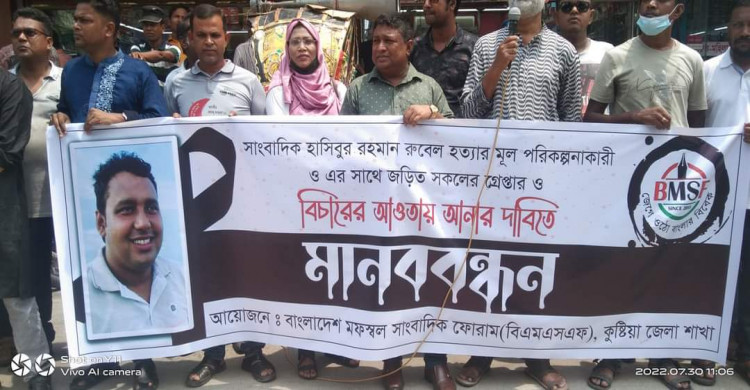 কুষ্টিয়ায় সাংবাদিক হাসিবুর রহমান রুবেল হত্যাকাণ্ডে মূল পরিকল্পনাকারীসহ জড়িত সকলের গ্রেফতার দাবিতে মানববন্ধন অনুষ্ঠিত হয়েছে। শনিবার (৩০ জুলাই) সকাল ১০টায় কুষ্টিয়া শহরের থানা মোড়ে বাংলাদেশ মফস্বল সাংবাদিক ফোরাম কুষ্টিয়া জেলা শাখার আয়োজনে এ মানববন্ধন অনুষ্ঠিত হয়।