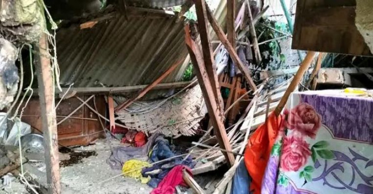 হঠাৎ করেই বটগাছ উপড়ে ঘরের ওপর পড়ে সম্পূর্ণ বিধ্বস্ত হয়ে গেছে আমেনা খাতুনের বসতঘর। স্বামীহারা বিধবা আমেনা খাতুন দুই সন্তানকে নিয়ে কোনোমতে দুঃখ-কষ্টে দিনযাপন করছিলেন। এরই মধ্যে মাথার গোঁজার ঠাঁইটুকু হারিয়ে আহাজারি করে বলছেন, ‘আমি এখন কিভাবে এই ঘর ঠিক করব, কোথায় থাকব?’