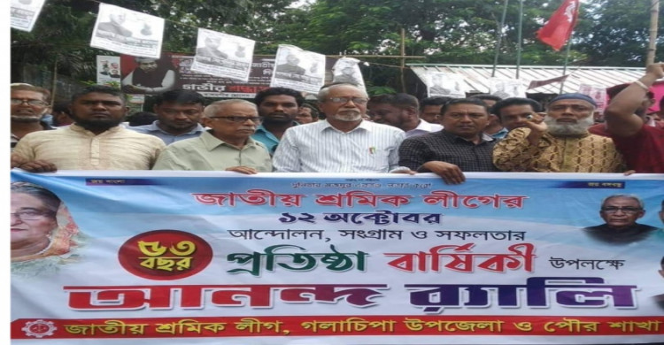 ‘দুনিয়ার মজদুর এক হও, লড়াই করো' স্লোগান নিয়ে পটুয়াখালীর গলাচিপায় জাতীয় শ্রমিক লীগের ৫৩তম প্রতিষ্ঠাবার্ষিকী সুসজ্জিত ব্যান্ডদল নিয়ে উৎসবমুখর পরিবেশে পালিত হয়েছে। প্রতিষ্ঠাবার্ষিকী উপলক্ষে কর্মসূচির অংশ হিসেবে বুধবার (১২ অক্টোবর) সকাল ৮টায় দলীয় কার্যালয়ে জাতীয় ও দলীয় পতাকা উত্তোলন, সকাল ৮টা ৩০ মিনিটে বঙ্গবন্ধুর প্রতিকৃতিতে ফুলেল শ্রদ্ধা নিবেদন করা হয়।