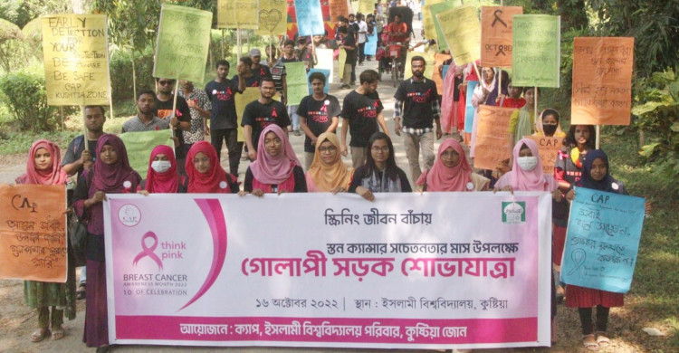 ইসলামী বিশ্ববিদ্যালয়ে (ইবি) স্তন ক্যান্সার সচেতনতায় গোলাপী সড়ক শোভাযাত্রা ও আলোচনা সভার আয়োজন করে স্বেচ্ছাসেবী ও সচেতনতামূলক সংগঠন ক্যান্সার অ্যাওয়ারনেস প্রোগ্রাম ফর ওমেন (ক্যাপ) কুষ্টিয়া জোন। অক্টোবর মাসকে স্তন ক্যান্সার সচেতনতার মাস ঘোষণা করে মাসব্যাপী কর্মসূচির অংশ হিসেবে রোববার (১৬ অক্টোবর) এ আয়োজন করে সংগঠনটি।