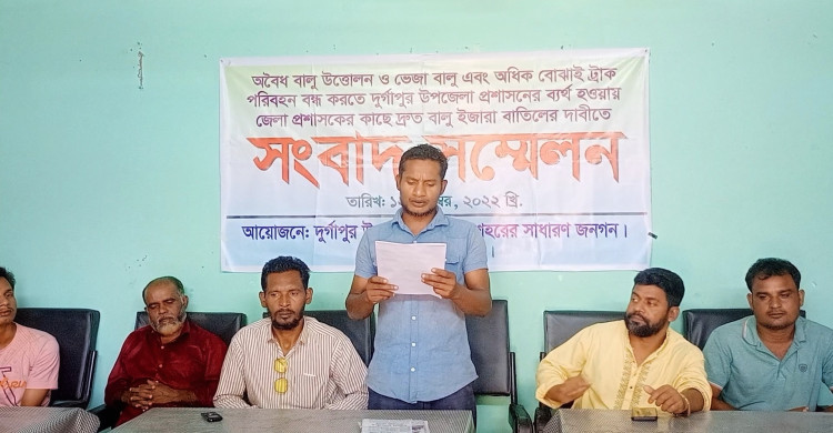 পরবর্তীতে এর ব্যত্যয় ঘটলে ইজারাদারের বিরুদ্ধে বিধি মোতাবেক ব্যবস্থা নেয়া হবে বলে জানান তিনি। এরপরও প্রতিদিন শত শত গাড়ি ভেজা বালু পরিবহন করে শহরের পরিবেশ নষ্ট করায় স্থানীয় পরিবেশের ভারসাম্য নষ্ট হওয়ায় এলাকাবাসীর পক্ষে আমরা এই সংবাদ সম্মেলনের মাধ্যমে প্রতিবাদ জানাচ্ছি। বালু উত্তোলনের ক্ষেত্রে বিধিতে উল্লিখিত নির্ধারিত পদ্ধতি ব্যবহার করা হচ্ছে না। বিধায় এ বিষয়ে জেলা, উপজেলাসহ ঊর্ধ্বতন কর্তৃপক্ষের দৃষ্টি আকর্ষণ করছি। আমরা নিরাপদ দুর্গাপুর চাই।