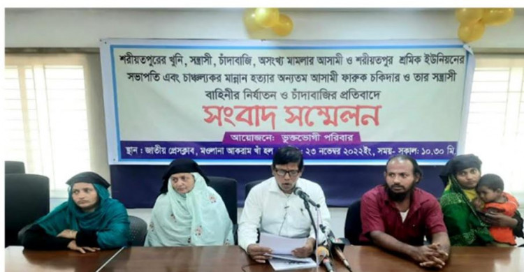 শরীয়তপুরের খুনি, সন্ত্রাসী, চাঁদাবাজ, অসংখ্য মামলার আসামী ও শরীয়তপুর শ্রমিক ইউনিয়নের সভাপতি এবং চাঞ্চল্যকর মান্নান হত্যার অন্যতম আসামী ফারুক চকিদার ও তার সন্ত্রাসী বাহিনীর নির্যাতন ও চাঁদাবাজির প্রতিবাদে সংবাদ সম্মেলন অনুষ্ঠিত হয়েছে। বুধবার (২৩ নভেম্বর) জাতীয় প্রেসক্লাবের মওলানা আকরাম খাঁ হলে এই সংবাদ সম্মেলনের আয়োজন করে ভুক্তভোগী পরিবারের সদস্যরা। সংবাদ সম্মেলনে লিখিত বক্তব্যে শরীয়তপুর সদরের পালং গ্রামের মৃত হাচেন শরীফ তালুকদারের ছেলে আতাউর রহমান তালুকদার বলেন, আমাদের জেলার দুর্ধর্ষ খুনি, সন্ত্রাসী, চাঁদাবাজী, অসংখ্য মামলার আসামী, শরীয়তপুর জেলা শ্রমিক ইউনিয়নের সভাপতি ও আওয়ামী লীগ নেতা আব্দুল মান্নান হত্যার অন্যতম আসামী ফারুক চকিদার ও তার সন্ত্রাসী বাহিনীর নির্যাতন ও চাঁদাবাজীর বিরুদ্ধে আজকের এই সংবাদ সম্মেলন।