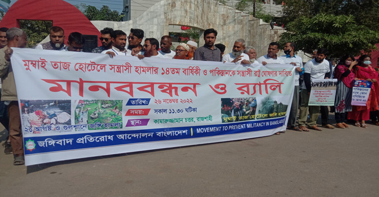 শনিবার (২৬ নভেম্বর) মুম্বাইয়ে জঙ্গী সন্ত্রাসী হামলার ১৪তম বার্ষিকী স্মরণে জঙ্গিবাদ প্রতিরোধ আন্দোলন বাংলাদেশ রাজশাহী মহানগর উদ্যোগে কামরুজ্জামান চত্বরে সকাল ১১.৩০ মিনিটে মানববন্ধন ও র্যালীর অনুষ্ঠিত হয়েছে।
