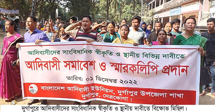 নেত্রকোণার দুর্গাপুরে বাংলাদেশ আদিবাসী ইউনিয়ন দুর্গাপুর উপজেলা কমিটির আয়োজনে আদিবাসীদের সাংবিধানিক স্বীকৃতি ও স্থানীয় দাবীতে এক সমাবেশ ও মাননীয় প্রধানমন্ত্রী বরাবর স্মারকলিপি প্রদান করা হয়েছে।বৃহস্পতিবার দুপুরে উপজেলা নিবার্হী অফিসারের কাছে এ স্মারকলিপি প্রদান করা হয়।