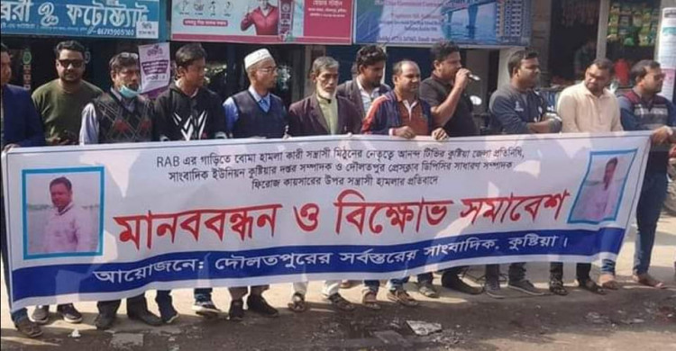 আনন্দ টিভির কুষ্টিয়া জেলা প্রতিনিধি, সাংবাদিক ইউনিয়ন কুষ্টিয়া দপ্তর সম্পাদক ও দৌলতপুর প্রেসক্লাব ডিপিসির সাধারণ সম্পাদক ফিরোজ কায়সারের উপর সন্ত্রাসী হামলার প্রতিবাদে দৌলতপুর উপজেলার সর্বস্তরের সাংবাদিকদের আয়োজনে মানববন্ধন ও বিক্ষোভ সমাবেশ অনুষ্ঠিত হয়েছে।