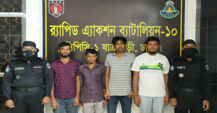আটকরা হলেন- মো. তৌহিদুল ইসলাম (২৯), মো. মনিরুল ইসলাম (৩৩), মো. কাউছার (২৪) ও মো. জুয়েল (৩৫)। শুক্রবার (১৬ ডিসেম্বর) রাতে র্যাব-১০-এর সহকারী পরিচালক (এএসপি) এনায়েত কবীর শোয়েব বিষয়টি নিশ্চিত করেন।
