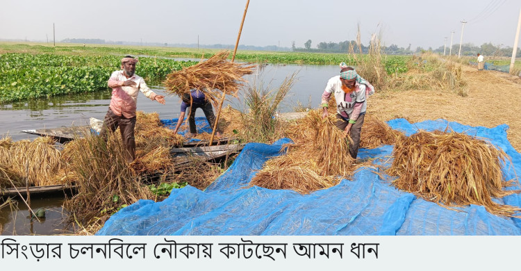 সিংড়ার চলনবিলে নৌকায় কাটছেন আমন ধান