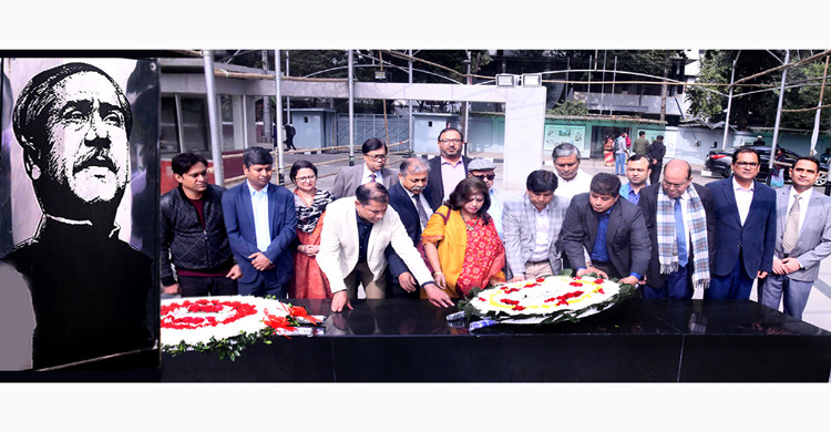 বঙ্গবন্ধুর প্রতিকৃতিতে শিক্ষক সমিতি নেতৃবৃন্দের পুষ্পস্তবক অর্পণ