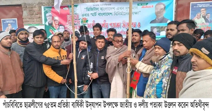 জয়পুরহাটের পাঁচবিবিতে ছাত্রলীগের গৌরব ঐতিহ্য সংগ্রাম ও সাফল্যের ৭৫তম প্রতিষ্ঠা বার্ষিকী উদযাপন। বাংলাদেশ ছাত্রলীগ পাঁচবিবি উপজেলা ও পৌর শাখা ছাত্রলীগের আয়োজনে আজ বুধবার রেলষ্টেশন সংলগ্ন দলীয় কার্যালয়ে সকাল সাড়ে ১০ টায় জাতীয় ও দলীয় পতাকা উত্তলন করা হয়। উত্তোলনের পরে জাতির পিতা বঙ্গবন্ধু শেখ মুজিবর রহমানের প্রতিককৃতিতে শ্রদ্ধা নিবেদন করেন জেলা পরিষদের সদস্য ও উপজেলা আওয়ামীলীগের যুগ্ম সম্পাদক আবু সাঈদ আল মাহবুব চন্দন। এ সময় উপস্থিত ছিলেন বালিঘাটা ইউপি চেয়ারম্যান নুরুজ্জামান চৌধুরী বিপ্লব, উপজেলা ছাত্রলীগের সভাপতি আকরাম হোসেন তালুকদার, সম্পাদক পলাশ কুমার ঘোষ, পৌর ছাত্রলীগের সম্পাদক সাইদুর রহমান রাজু, ছাত্র নেতা মাহমুদুল হাসান সাগর, আপেল হোসেন, খোকন, জাবেদ প্রমূখ।