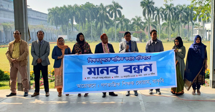 বাকৃবিতে শিক্ষক লাঞ্ছনার ঘটনায় অভিযুক্তদের শাস্তির দাবিতে মানববন্ধন