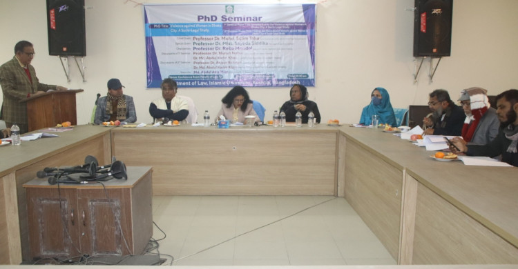 ইসলামী বিশ্ববিদ্যালয়ে (ইবি) 'ঢাকা শহরে নারীর প্রতি সহিংসতাঃ একটি সামাজিক-আইনি গবেষণা' বিষয়ক দিনব্যাপী পিএইচডি সেমিনার অনুষ্ঠিত হয়েছে। মঙ্গলবার (১৭ জানুয়ারি) বেলা সাড়ে ১১ টায় বিশ্ববিদ্যালয়ের আইন অনুষদের কনফারেন্স রুমে এই আয়োজন করে আইন বিভাগ।