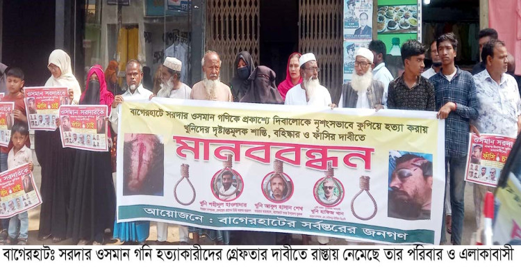 বাগেরহাটে নির্বাচন পরবর্ত্তি সহিংসতায় নিহত ওসমান গনি হত্যা কারীদের গ্রেফতার দাবীতে রাস্তায় মানববন্ধন