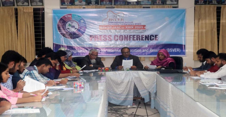 বিএসভিইআরের বার্ষিক বৈজ্ঞানিক সম্মেলন উপলক্ষ্যে আয়োজিত এক সংবাদ সম্মেলনে লিখিত বক্তব্যে এসব কথা বলেন বিএসভিইআরের সাধারণ সম্পাদক ও বাকৃবির মাইক্রোবায়োলজি ও হাইজিন বিভাগের অধ্যাপক ড. মো. আরিফুল ইসলাম। শুক্রবার (২৪ ফেব্রুয়ারি) সকাল ১০ টায় বাকৃবির ভেটেরিনারি অনুষদের মেডিসিন সম্মেলন কক্ষে ওই সংবাদ সম্মেলনটি অনুষ্ঠিত হয়।