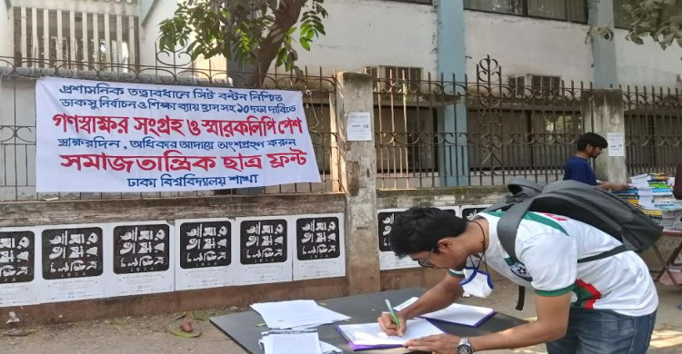 ঢাকা বিশ্ববিদ্যালয়ের বিভিন্ন অনিয়ম, ডাকসু নির্বাচন সহ ১০ দফা দাবিতে গণস্বাক্ষর কর্মসূচি পালন করছে ঢাকা বিশ্ববিদ্যালয় সমাজতান্ত্রিক ছাত্র ফ্রন্ট। গত ৮ ফেব্রুয়ারি থেকে ক্যাম্পাসে জুড়ে মাসব্যাপী গণস্বাক্ষর কর্মসূচি পালন করে আসছে সংগঠনটি। গণস্বাক্ষর কর্মসূচি শেষে আগামী ৯ মার্চ বিশ্ববিদ্যালয় উপাচার্য অধ্যাপক ড. মো আখতারুজ্জামান বরাবর স্মারকলিপি প্রদান করা হবে বলে জানিয়েছে ঢাবি সমাজতান্ত্রিক ছাত্র ফ্রন্ট।