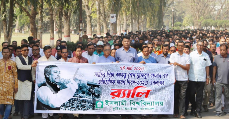বিনম্র শ্রদ্ধার সাথে ইসলামী বিশ্ববিদ্যালয়ে (ইবি) ঐতিহাসিক ৭ মার্চ জাতির পিতা বঙ্গবন্ধু শেখ মুজিবুর রহমানের ভাষণ দিবস পালিত হয়েছে। দিবসটি উপলক্ষ্যে মঙ্গলবার (০৭ মার্চ) সকাল ১০টার দিকে প্রশাসন ভবন চত্বর থেকে বর্ণাঢ্য র্যালি বের করে বিশ্ববিদ্যালয় প্রশাসন।