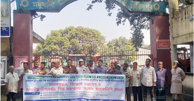 চিনিকলের অবসরপ্রাপ্ত শ্রমিক কর্মচারী-কর্মকর্তাদের পাওনা পরিশোধের দাবীতে মানববন্ধন বিক্ষোভ ও স্মারকলিপি পেশ